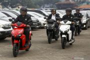 Menristekdikti Mohamad Nasir (kiri) mengendarai sepeda motor listrik Gesits menuju lokasi acara Indonesia Startup Summit 2019 di JIExpo Kemayoran, Jakarta, Rabu (10/4/2019). Acara tersebut dihadiri 5.000 penggiat startup di Indonesia. ANTARA FOTO/Nova Wahyudi/aww.