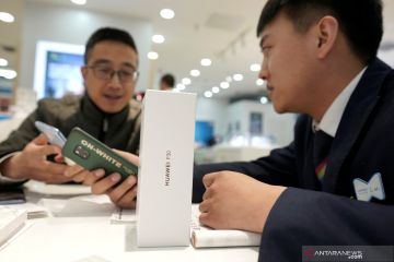 Konsumen menggunakan gawai pintar terbaru Huawei P30 usai penjualan Huwaei P30 dan P30 Pro dimulai di Toko Huwaei, Beijing, Cina, Kamis (11/4/2019). ANTARA FOTO/REUTERS/Jason Lee/wsj.