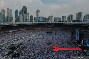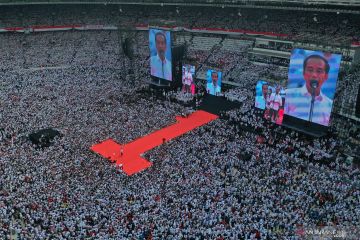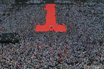 Calon Presiden nomor urut 01 Joko Widodo (tengah) berpidato saat Konser Putih Bersatu di Stadion Utama GBK, Jakarta, Sabtu (13/4/2019). Konser itu merupakan kampanye akbar untuk memenangkan pasangan Jokowi-Ma'ruf Amin. ANTARA FOTO/Akbar Nugroho Gumay/hp.