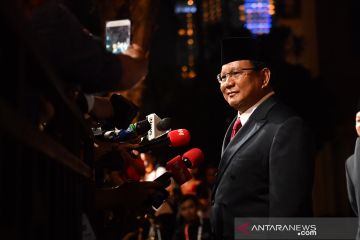 Capres nomor urut 02 Prabowo Subianto menyapa para wartawan setibanya di lokasi debat capres kelima di Hotel Sultan, Jakarta, Sabtu (13/4/2019). Debat itu mengangkat tema ekonomi dan kesejahteraan sosial, keuangan dan investasi serta perdagangan dan industri. ANTARA FOTO/Rivan Awal Lingga/pras.