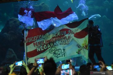 Penyelam membentangkan spanduk sukseskan Pemilu serentak 2019 di Akuarium Seaworld Ancol, Jakarta, Minggu (14/4/2019). Seaworld Ancol menggelar sosialisasi sukseskan Pemilu di dalam air untuk meningkatkan partisipasi pemilih serta mencegah golput kepada pengunjung, yang berlangsung sejak 13-17 April 2019 mendatang. ANTARA FOTO/Indrianto Eko Suwarso/wsj.