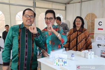 Duta Besar Indonesia untuk Cina Djauhari Oratmangun (kiri) beserta istri Sih Elsiwii Oratmangun (tengah) disaksikan Wakil Dubes Listyowati (kanan) mengacungkan jari kelingking kiri yang sudah dicelupkan tinta usai menggunakan hak suaranya di TPS 001 KBRI Beijing, Cina, Minggu (14/4/2019). Penghitungan surat suara yang sudah dicoblos oleh para pemilih baru akan dihitung pada Rabu (17/4/2019) bersamaan dengan Pemilu serentak di Indonesia. ANTARA FOTO/M. Irfan Ilmie/wsj.