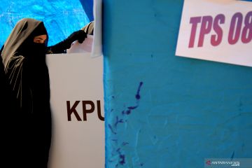 Jamaah An Nadzir menggunakan hak pilih dalam Pemilu 2019 di Tempat Pemungutan Suara (TPS) 08 Kecamatan Bonto Marannu, Kabupaten Gowa, Sulawesi Selatan, Rabu (17/4/2019). ANTARA FOTO/Abriawan Abhe/foc.