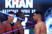 Petinju Terence Crawford dan Amir Khan saling menatap saat keduanya melakukan sesi timbang badan, di Madison Square Garden, New York, AS, Sabtu (19/4/2019). ANTARA FOTO/Reuters/Andrew Couldridge/ama.