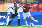 Pemain AC Milan Krzysztof Piatek (kiri) melepaskan tendangan melewati pemain Parma Bruno Alves pada pertandingan Serie A Italia di Stadion Ennio Tardini, Parma, Italia, Sabtu (20/4/2019). ANTARA FOTO/REUTERS/Jennifer Lorenzini/aww.