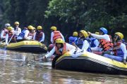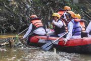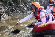 Pekerja milenial perempuan PT Askrindo (Persero) mengambil sampah di aliran sungai saat operasi bersih Sungai Ciliwung di Jakarta, Minggu (21/4/2019). Millenials Askrindo bersama Yayasan Lintas Sungai Abadi (Yalisa) membersihkan Sungai Ciliwung untuk merayakan HUT ke-48 Askrindo dan Hari Kartini. ANTARA FOTO/Hafidz Mubarak A/hp.