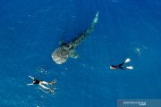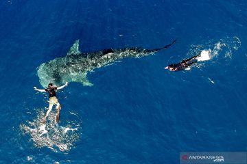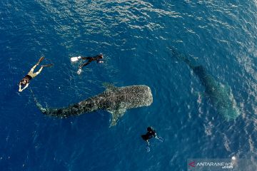Sejumlah wisatawan berenang bersama seekor Hiu Paus di perairan Botubarani, Kabupaten Bone Bolango, Gorontalo, Minggu (21/4/2019). Pengamat mencatat bahwa puncak musim kedatangan kelompok Hiu Paus ke perairan tersebut yaitu pada bulan Mei dan Juni. ANTARA FOTO/Dian Bawenti/Aws/hp.