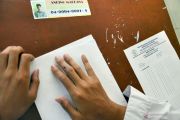 Siswa penyandang disabilitas tunanetra dan penglihatan terbatas (lowvision) SDLB/A YKAB Surakarta mengerjakan soal ujian dengan naskah huruf braille saat Ujian Sekolah Berbasis Nasional (USBN) di sekolah setempat, Solo, Jawa Tengah, Senin (22/04/2019). Ujian tersebut digelar sebagai salah satu syarat kelulusan bagi siswa. FOTO/Maulana Surya/aww.
