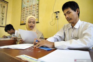 Siswa kelas 6 SDLB tunanetra mengerjakan soal Pendidikan Agama Islam saat Ujian Sekolah Berstandar Nasional (USBN) SD di SLB ABCD Sejahtera, Kelurahan Loji, Kota Bogor, Jawa Barat, Senin (22/4/2019). Dua siswa penyandang disabilitas tunanetra di sekolah tersebut mengikuti USBN SD yang dilaksanakan serentak di Indonesia. ANTARA FOTO/Arif Firmansyah/aww.