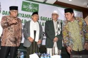 Ketua Umum Pengurus Besar Nahdlatul Ulama (PBNU) KH Said Aqil Siradj (kiri) dan Mustasyar PBNU yang juga Cawapres nomor urut 01 KH Ma'ruf Amin (kedua kiri) berbincang dengan Rais Aam PBNU KH Miftahul Akhyar (kedua kanan) dan Sekjen PBNU Helmy Faishal Zaini (kanan) saat menghadiri silaturahmi di gedung PBNU, Jakarta, Senin (22/4/2019). Silaturahmi tersebut diisi dengan penyampaian gagasan kebangsaan PBNU. ANTARA FOTO/Hafidz Mubarak A/hp.