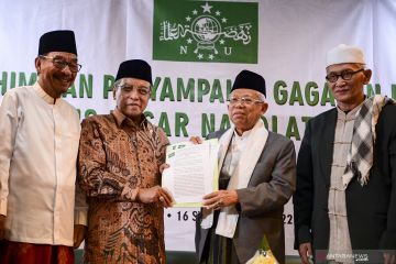 Ketua Umum Pengurus Besar Nahdlatul Ulama (PBNU) KH Said Aqil Siradj (kedua kiri) menyerahkan berkas amanat NU kepada Mustasyar PBNU yang juga Cawapres nomor urut 01 KH Ma'ruf Amin (kedua kanan) disaksikan Rais Aam PBNU KH Miftahul Akhyar (kanan) dan Rais Syuriah PBNU KH Ali Akbar Marbun (kiri) saat bersilaturahmi di gedung PBNU, Jakarta, Senin (22/4/2019). Silaturahmi tersebut diisi dengan penyampaian gagasan kebangsaan PBNU. ANTARA FOTO/Hafidz Mubarak A/hp.