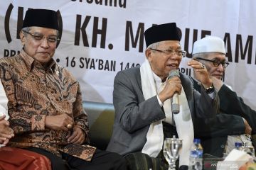 Mustasyar PBNU yang juga Cawapres nomor urut 01 KH Ma'ruf Amin (tengah) disaksikan Ketua Umum Pengurus Besar Nahdlatul Ulama (PBNU) KH Said Aqil Siradj (kiri) dan Rais Aam PBNU KH Miftahul Akhyar (kanan) menyampaikan sambutan saat bersilaturahmi di gedung PBNU, Jakarta, Senin (22/4/2019). Silaturahmi tersebut diisi dengan penyampaian gagasan kebangsaan PBNU. ANTARA FOTO/Hafidz Mubarak A/hp.