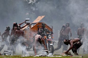 Prajurit Kopassus TNI AD melakukan unjuk kebolehan dalam peringatan HUT Ke-67 Kopassus di Mako Kopassus, Cijantung, Jakarta Timur, Rabu (24/4/2019). HUT Ke-67 Kopassus mengangkat tema Mewujudkan Prajurit Kopassus yang Profesional, Kuat dan Tangguh serta Adaptif Menghadapi Tantangan Global. ANTARA FOTO/Sigid Kurniawan/pras.