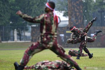 Prajurit Kopassus TNI AD melakukan unjuk kebolehan dalam peringatan HUT Ke-67 Kopassus di Mako Kopassus, Cijantung, Jakarta Timur, Rabu (24/4/2019). HUT Ke-67 Kopassus mengangkat tema Mewujudkan Prajurit Kopassus yang Profesional, Kuat dan Tangguh serta Adaptif Menghadapi Tantangan Global. ANTARA FOTO/Sigid Kurniawan/pras/pri
