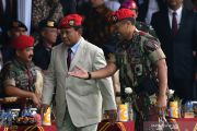 Mantan Danjen Kopassus Letjen TNI (Purn) Prabowo Subianto (kiri) didampingi Danjen Kopassus Mayjen TNI I Nyoman Cantiasa menghadiri peringatan HUT Ke-67 Kopassus di Mako Kopassus, Cijantung, Jakarta Timur, Rabu (24/4/2019). Perayaan tersebut mengangkat tema Mewujudkan Prajurit Kopassus yang Profesional, Kuat dan Tangguh serta Adaptif Menghadapi Tantangan Global. ANTARA FOTO/Sigid Kurniawan/hp/pri