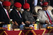 Mantan Danjen Kopassus Letjen TNI (Purn) Prabowo Subianto (kanan) menghadiri peringatan HUT Ke-67 Kopassus di Mako Kopassus, Cijantung, Jakarta Timur, Rabu (24/4/2019). Perayaan tersebut mengangkat tema Mewujudkan Prajurit Kopassus yang Profesional, Kuat dan Tangguh serta Adaptif Menghadapi Tantangan Global. ANTARA FOTO/Sigid Kurniawan/hp/pri