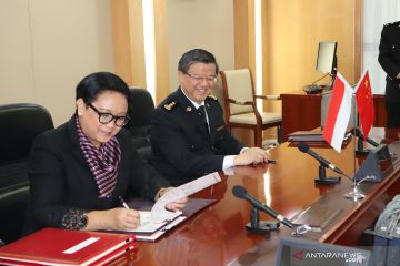 Menteri Luar Negeri Retno LP Marsudi (kiri) bersama Menteri Bea Cukai Cina Ni Yue Feng menandatangani protokol impor manggis dari Indonesia, di Beijing, Kamis (25/4). Penandatanganan tersebut dilakukan di sela-sela KTT Kerja Sama Ekonomi Sabuk Jalan (BRF) II di Beijing pada 24-27 April 2019 yang juga dihadiri oleh Wakil Presiden Jusuf Kalla. ANTARA FOTO/M. Irfan Ilmie/aww.