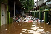 Seorang warga berusaha membersihkan sampah yang terbawa aliran banjir di kawasan permukiman penduduk Cililitan Kecil, Jakarta, Jumat (26/4/2019). Air kiriman dari bendungan Katulampa hingga sungai Ciliwung meluap tersebut mengakibatkan sejumlah rumah tinggal di bantaran Sungai Ciliwung, Jakarta terendam air satu hingga dua meter. ANTARA FOTO/Risky Andrianto/hp.