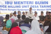 Menteri Badan Usaha Milik Negara (BUMN) Rini M Soemarno (tengah) menyampaikan sambutan saat melakukan kunjungan kerja di Sentral Pengolahan Beras Terpadu (SPBT)/"Rice Milling Unit" (RMU) di Desa Taringgulandeuh, Kiarapedes, Purwakarta, Jawa Barat, Jumat (26/4/2019). RMU tersebut merupakan salah satu dari tiga RMU di Purwakarta yang di bangun oleh Bank Tabungan Negara (BTN) sebagai upaya BUMN mendukung program kewirausahaan pertanian untuk meningkatkan kesejahteraan petani dan usaha desa. ANTARA FOTO/M Ibnu Chazar/hp.