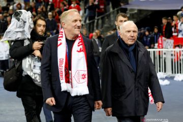 Pemilik klub sepak bola Stade Rennes Francois-Henri Pinault (kiri) berjalan bersama ayahnya setelah timnya berhasil menjuarai Coupe de France usai mengalahkan Paris Saint German di babak final, di Stadion Stade de France, Saint Denis, Perancis, Sabtu (27/4/2019), Rennes dan PSG bermain imbang 2-2 sampai perpanjangan waktu, kemudian Rennes menang 6-5 dalam adu penalti. ANTARA FOTO/Reuters-Charles Platiau/hp