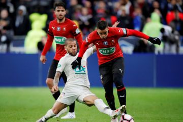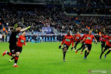 Para pemain Stade Rennes melakukan selebrasi setelah memastikan gelar juara Coupe de France usai mengalahkan Paris Saint German di babak final, di Stadion Stade de France, Saint Denis, Perancis, Sabtu (27/4/2019), Rennes dan PSG bermain imbang 2-2 sampai perpanjangan waktu, kemudian Rennes menang 6-5 dalam adu penalti. ANTARA FOTO/Reuters-Charles Platiau/hp