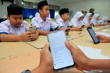 Sejumlah siswa mengikuti simulasi ujian kenaikan kelas berbasis android atau menggunakan smartphone di Madrasah Tsanawiyah Negeri (MTsN) 3 Meulaboh, Aceh Barat, Aceh, Selasa (30/4/2019). Simulasi tersebut bertujuan untuk menguji kemampuan dan kesiapan siswa serta untuk memastikan dan mengukur bisa tidaknya melaksanakan ujian kenaikan kelas berbasis smartphone. ANTARA FOTO/Syifa Yulinnas/aww/pri