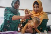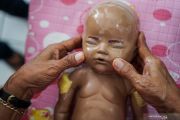 Kader Posyandu mempraktekan cara memijat bayi pada kegiatan Pelatihan Perawatan Bayi Untuk Kader Posyandu di desa Jetis, Sukoharjo, Jawa Tengah, Rabu (1/5/2019). Kegiatan tersebut untuk memberikan pengetahuan kepada kader Posyandu cara memijat bayi secara baik dan benar agar bayi tumbuh sehat dan sesuai kurva pada Kartu Menuju Sehat (KMS). ANTARA FOTO/Mohammad Ayudha/ama.