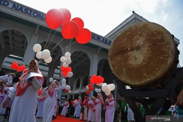Warga membawa balon saat digelar 'Magengan Kubro' di Masjid Al Akbar Surabaya, Jawa Timur, Jumat (3/5/2019). Magengan Kubro tersebut dalam rangka menyambut Ramadhan 1440 H. ANTARA FOTO/Zabur Karuru/foc.