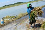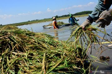 Petani memanen padi di persawahan yang terendam banjir di Desa Podoroto, Kecamatan Kesamben, Jombang, Jawa Timur, Jumat (3/5/2019). Banjir yang disebabkan tingginya curah hujan mengakibatkan ratusan hektare tanaman padi di wilayah itu terendam banjir dan memaksa petani memanen lebih awal. ANTARA FOTO/Syaiful Arif/pras.