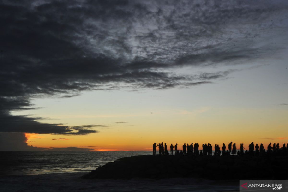 Siluet sejumlah jamaah tarekat Syattariyah menanti kemunculan bulan (hilal) di pantai Ulakan, Padangpariaman, Sumatera Barat, Senin (6/5/2019). Jamaah Syattariyah Sumbar menentukan jatuhnya 1 Ramadhan dengan melihat bulan menggunakan mata telanjang di pantai berdasarkan penghitungan hisab takwim khamsiah, dan mereka akan mulai berpuasa pada Selasa (7/5/2019). ANTARA FOTO/Iggoy el Fitra/aww.