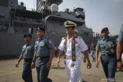 Kafasharkan Lantamal III Jakarta Kolonel Laut Yudi Susilo (kedua kiri) menyambut kedatangan Komandan satuan misi anti pembajakan Pasukan Bela Diri Maritim Jepang, Nishiyama (kedua kanan) saat tiba bersama kapal JS Samidare di dermaga JICT II, Pelabuhan Tanjung Priok, Jakarta, Rabu (8/5/2019). Kapal JS Samidare singgah ke Indonesia usai menyelesaikan misi anti pembajakan di Somalia sekaligus dalam rangka memperingati hubungan Indonesia-Jepang ke 61. ANTARA FOTO/Dhemas Reviyanto/hp.