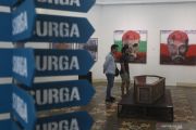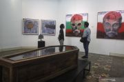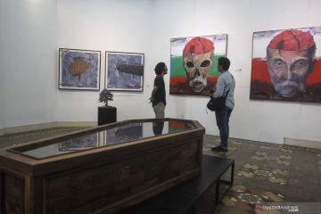 Pengujung melihat karya lukis dan instalasi yang dipajang pada pameran seni rupa bertajuk Counter Attack di Balai Soedjatmoko Solo, Jawa Tengah, Rabu (8/5/2019). Pameran seni dari para perupa Komunitas LED Studios tersebut mengangkat berbagai isu pesan sosial, politik, estetik maupun artistik dalam bentuk karya lukis dan intalasi. ANTARA FOTO/Maulana Surya/hp.