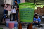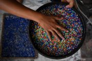 Pekerja membuat adonan dari cacahan plastik untuk di jadikan jam dinding di 'Robries galeri' di Surabaya, Jawa Timur, Rabu (8/5/2019). Komunitas berbasis lingkungan tersebut mengolah limbah khususnya plastik menjadi barang bernilai jual seperti jam dinding, meja, bangku dan lainnya. ANTARA FOTO/Zabur Karuru/pras.
