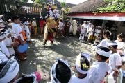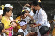 Pelajar memercikkan air suci kepada rekannya saat persembahyangan bersama perayaan Hari Saraswati atau hari turunnya ilmu pengetahuan di SD Negeri 1 Sumerta, Denpasar, Bali, Sabtu (11/5/2019). Hari Raya Saraswati merupakan hari yang diperingati umat Hindu untuk mensyukuri sekaligus memohon agar ilmu pengetahuan yang ada dapat bermanfaat bagi kesejahteraan umat manusia. ANTARA FOTO/Fikri Yusuf/hp.