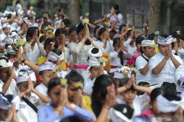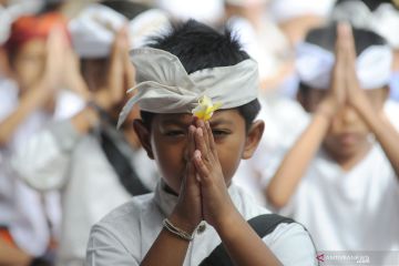 Sejumlah pelajar bersembahyang bersama saat perayaan Hari Saraswati atau hari turunnya ilmu pengetahuan di SD Negeri 1 Sumerta, Denpasar, Bali, Sabtu (11/5/2019). Hari Raya Saraswati merupakan hari yang diperingati umat Hindu untuk mensyukuri sekaligus memohon agar ilmu pengetahuan yang ada dapat bermanfaat bagi kesejahteraan umat manusia. ANTARA FOTO/Fikri Yusuf/hp.