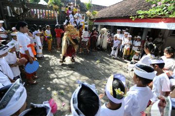 Pelajar menampilkan tarian Barong usai persembahyangan bersama saat perayaan Hari Saraswati atau hari turunnya ilmu pengetahuan di SD Negeri 1 Sumerta, Denpasar, Bali, Sabtu (11/5/2019). Hari Raya Saraswati merupakan hari yang diperingati umat Hindu untuk mensyukuri sekaligus memohon agar ilmu pengetahuan yang ada dapat bermanfaat bagi kesejahteraan umat manusia. ANTARA FOTO/Fikri Yusuf/hp.