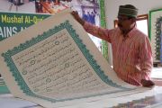 Hayatuddin menunjukkan lembaran Alquran Akbar ke-11 di kompleks Universitas Saint Alquran (UNSIQ) Kalibeber, Mojotengah, Wonosobo, Jateng, Sabtu (11/5/2019). Sejak tahun 1991, tim yang terdiri dari tiga orang itu telah menyelesaikan pembuatan Alquran Akbar berukuran 2 x1,5 meter (lima buah), 1,5 x 1 meter (empat buah) dan 1 x 0,75 meter (satu buah). ANTARA FOTO/Anis Efizudin/wsj.