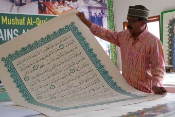 Hayatuddin menyelesaikan penulisan Alquran Akbar ke-11 di kompleks Universitas Saint Alquran (UNSIQ) Kalibeber, Mojotengah, Wonosobo, Jateng, Sabtu (11/5/2019). Sejak tahun 1991, tim yang terdiri dari tiga orang itu telah menyelesaikan pembuatan Alquran Akbar berukuran 2 x1,5 meter (lima buah), 1,5 x 1 meter (empat buah) dan 1 x 0,75 meter (satu buah). ANTARA FOTO/Anis Efizudin/wsj.