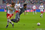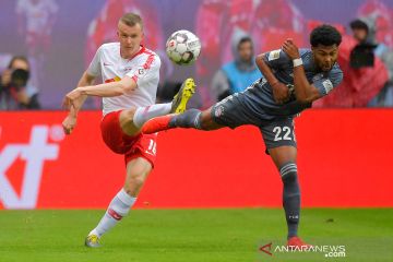 Pemain Bayern Munchen Kingsley Coman berebut bola dengan pemain RB Leipzig Marcel Halstenberg pada pertandingan Bundesliga di Red Bull Arena, Leipzig, Sabtu (11/5/2019). Kedua tim bermain imbang 0-0. ANTARA FOTO/REUTERS/Kai Pfaffenbach/pras.