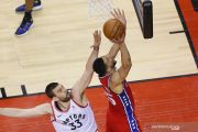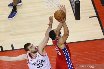 Pebasket Toronto Raptors Marc Gasol (33) berebut bola dengan pebasket Philadelphia 76ers Ben Simmons (25) pada pertandingan gim ketujuh playoff NBA di Scotiabank Arena, Toronto, Ontario, Senin (13/5/2019). ANTARA FOTO/Reuters/USA TODAY Sports/pras.