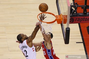 Pebasket Toronto Raptors Kawhi Leonard (2) berebut bola dengan pebasket Philadelphia 76ers Ben Simmons (25) pada pertandingan gim ketujuh playoff NBA di Scotiabank Arena, Toronto, Ontario, Senin (13/5/2019). ANTARA FOTO/Reuters/USA TODAY Sports/pras.