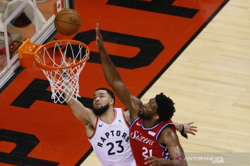 Pebasket Toronto Raptors Fred VanVleet (23) berebut bola dengan pebasket Philadelphia 76ers Joel Embiid (21) pada pertandingan gim ketujuh playoff NBA di Scotiabank Arena, Toronto, Ontario, Senin (13/5/2019). ANTARA FOTO/Reuters/USA TODAY Sports/pras.