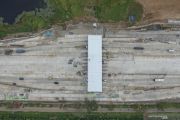 Foto udara pembangunan Gerbang Tol Cikampek Utama di KM 70 Tol Jakarta-Cikampek, Cikampek, Jawa Barat, Kamis (16/5/2019). Gerbang tol tersebut dibangun untuk menggantikan Gerbang Tol Cikarang Utama yang mengalami penyempitan akibat proyek Jalan Tol Layang Jakarta-Cikampek sehingga dapat mengurangi kepadatan antrean kendaraan terutama pada arus mudik lebaran 2019. ANTARA FOTO/Hafidz Mubarak A/wsj/pri