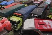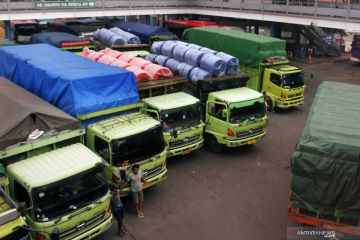 Puluhan bus dan truk yang akan menyeberang ke Pulau Sumatera antre sebelum masuk ke kapal feri di Pelabuhan Merak, Banten, Jumat (17/5/2019). Untuk mengantisipasi kepadatan pada puncak arus mudik mendatang, pihak otoritas pelabuhan Merak-Bakauheni akan memberlakukan sistem ganjil genap untuk kendaraan pribadi, sementara jalur penyeberangan truk dipindahkan ke Tanjung Priok langsung menuju Pelabuhan Panjang di Lampung mulai tanggal 30 Mei sampai 3 Juni 2019. ANTARA FOTO/Weli Ayu Rejeki/wsj.