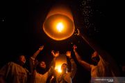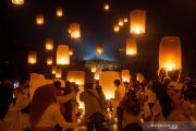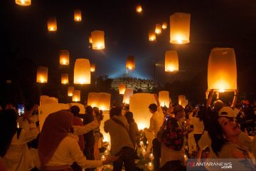 Pengunjung menerbangkan lampion perdamaian saat perayaan Waisak 2563 BE/2019 di Taman Lubini, Candi Borobudur, Magelang, Jawa Tengah, Minggu (19/5/2019). Pelepasan ribuan lampion itu merupakan simbol perdamaian serta menjadi rangkaian perayaan Tri Suci Waisak. ANTARA FOTO/Andreas Fitri Atmoko/wsj.