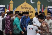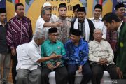 Ketua KPK Agus Rahardjo (bawah tengah) berjabat tangan dengan sejumlah perwakilan ormas islam dalam acara sinergi dakwah antikorupsi di Jakarta, Senin (20/5/2019). Kegiatan itu mengangkat tema bangkit bersama membangun peradaban antikorupsi melalui dakwah. ANTARA FOTO/Akbar Nugroho Gumay/hp.