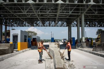 Pekerja beraktivitas dalam proyek pembangunan Gerbang Tol (GT) Kalihurip Utama di Cikampek, Karawang, Jawa Barat, Senin (20/5/2019). PT Jasa Marga Tbk akan mengoperasikan gerbang tol pengganti GT Cikarang Utama itu mulai 23 Mei 2019 yang diharapkan dapat memperlancar arus mudik dan balik Lebaran 2019. ANTARA FOTO/Aprillio Akbar/hp.