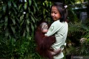 Pengasuh menggendong bayi Orangutan Kalimantan (Pongo pygmaeus) yang bernama Nadia di halaman Rumah Sakit Satwa Taman Safari Prigen, Pasuruan, Jawa Timur, Senin (20/5/2019). Bayi orangutan yang berumur 1,8 tahun tersebut dirawat oleh dokter dan pengasuh sejak usia delapan bulan karena induknya mengalami syndorme babyblues atau merasa asing dengan kehadirannya bayinya sehingga ditinggalkan. Kehadiran bayi ini menambah koleks orangutan di tempat itu menjadi 26 ekor. ANTARA FOTO/Zabur Karuru/hp/pri