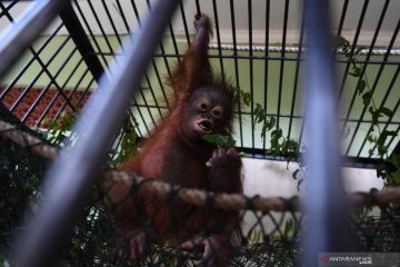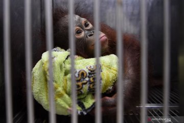 Bayi Orangutan Kalimantan (Pongo pygmaeus) yang bernama Nadia berada dalam kandang di Rumah Sakit Satwa Taman Safari Prigen, Pasuruan, Jawa Timur, Senin (20/5/2019). Bayi orangutan yang berumur 1,8 tahun tersebut dirawat oleh dokter dan pengasuh sejak usia delapan bulan karena induknya mengalami syndorme babyblues atau merasa asing dengan kehadirannya bayinya sehingga ditinggalkan. Kehadiran bayi ini menambah koleks orangutan di tempat itu menjadi 26 ekor. ANTARA FOTO/Zabur Karuru/hp/pri