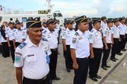 Petugas Kepala Kantor Syahbandar dan Otoritas Pelabuhan (KSOP) Kelas II Pontianak berdiri di atas kapal saat mengikuti apel pembukaan Posko Angkutan Laut Lebaran tahun 2019 di Pelabuhan Dwikora Pontianak, Kalimantan Barat, Senin (20/5/2019). Posko Angkutan Laut di Pelabuhan Dwikora yang dibuat KSOP Kelas II Pontianak tersebut turut melibatkan 23 instansi diantaranya Basarnas, Custom Imigrasi Karantina, TNI AL, Kepolisian serta Pelindo yang bertujuan untuk memberikan rasa aman dan nyaman bagi penumpang transportasi laut. ANTARA FOTO/Jessica Helena Wuysang/hp.